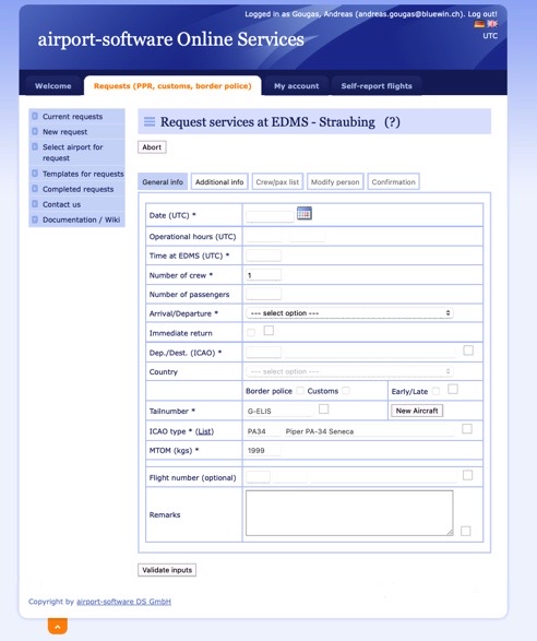 Σε περισσότερα από 40 αεροδρόμια / πεδία προσγείωσης της Γερμανίας χρησιμοποιείται ένα portal (εικ. 1) μέσω του οποίου ο κυβερνήτης του α/φ αφενός ειδοποιεί για την άφιξή του και εισάγει αν απαιτείται αστυνομικός / τελωνειακός έλεγχος. ΄Ενας κωδικός αποδίδεται στον κυβερνήτη τον οποίο, αυτός, εισάγει στο πεδίο 18 του σχεδίου πτήσης. Με τον τρόπο αυτό οι αρμόδιες υπηρεσίες λαμβάνουν γνώση των προθέσεων, καταγράφεται η επικείμενη άφιξη και μήνυμα αποστέλλεται στις αρμόδιες αρχές προκειμένου να λάβουν γνώση και να προγραμματίσουν τις ενέργειές τους. Η δήλωση αυτή, περιλαμβάνει και τα ονόματα / στοιχεία ταυτότητας όλων των επιβαινόντων καθώς και, τυχόν, αγαθά που μεταφέρονται επέχει δε, θέση υπεύθυνης δήλωσης με τις συνέπειες που αυτή συνεπάγεται.